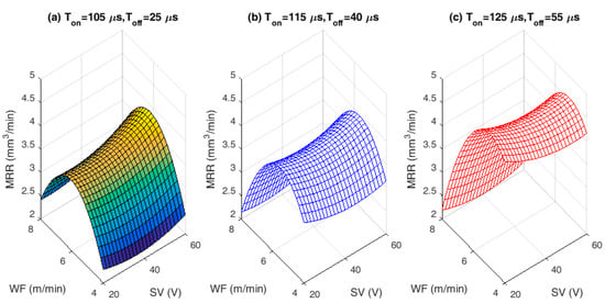 The economy of the machining operations needs to be taken care because for any manufacturer, more amount of machining or material removal has to happen at the economic condition. Therefore, the interaction effects of SV against MRR with varying WF rates for different hold values of Ton and Toff are plotted in Figure 4a–c. The effects of lower and higher MRR on the machined alloy during machining process have been justified and analyzed using morphological analysis in Figure 5a,b. As shown in Figure 4, as Ton increases within the selected ranges, the corresponding MRR also increases. The probable reason is due to the sufficient heat energy generated between the leading edge of ZnCBW and the workpiece material, resulting in faster erosion within the de-ionized dielectric fluid. It can also be seen that the MRR increases with increase in SV up to 40 V and then decreases rapidly. This is due to increase in discharge energy when overall pulse duration and SV increased (40 V); leading to higher removal rate. At higher SV, lesser the spark intensity and thus causes the reduction in MRR, irrespective of the pulse and pause time.