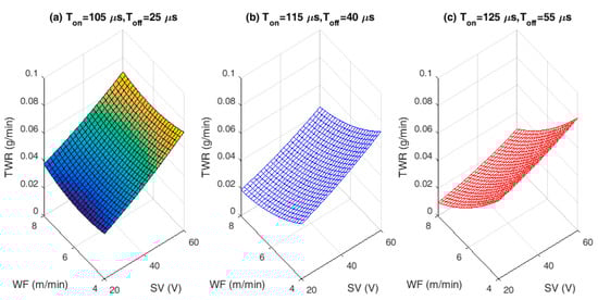 As the quality of ZnCBW differs from that of uncoated brass wire electrode, it is important to study the wear rate of the electrode material used for machining purpose. Therefore, interaction effects of SV against TWR with varying WF rates for different hold values of Ton and Toff are plotted in Figure 6a–c. In Figure 6, it is observed that, the rate of wear is minimal i.e., 0.03–0.08 g/min for varying pulse and pause time irrespective of SV and WF rates. Increase in Ton and Toff have greater effects on the workpiece material than the WF rate. It is also observed that, increase in SV has decreasing effect on the TWR and the wear rate is also greater when compared to Ton and Toff. This might be due to decrease of spark gap voltage between the wire and the workpiece material. At lower spark gap, there might be chances of wire erosion due to higher intensity of discharge spark energy.