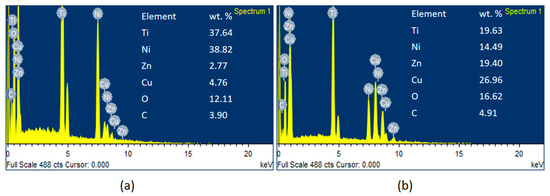 The effects of lower and higher TWR on the machined alloy during the machining process have been analyzed using energy dispersive X-ray spectrography (EDS) analysis and are exhibited in Figure 7a,b. The uncleared debris and the deposition of wire electrode on machined alloy were observed at lower and higher TWR as seen from Figure 7a,b. The EDS is used to identify the percentage of elements transformed from wire electrode to machined alloy surface after the machining process. The elemental analysis using EDS was performed area wise to evaluate the presence of wire material and other constituents which forms the carbides or oxides on the machined surface. The presence of Cu, Zn, and other constituents C and O elements on the machined surface area is noticeably evidenced. The EDS analysis in Figure 7a reveals that, when the TWR is lower, the presence of Cu and Zn is very low i.e., 4.76 and 2.77 wt % respectively. On the other hand, as depicted in Figure 7b, the TWR is found to be very high, where the carbon and oxide percentages are comparatively higher with 4.91 and 16.62 wt %, respectively. The deposition of the zinc coated brass wire on machined alloy is found to be 26.96 wt % of Cu and 19.40 wt % of Zn, which is very high when compared to the deposition in the lower TWR. The oxides may be formed due to high temperature induced during machining and high activity of Ti and Ni atoms. Cu and Zn phases were noticed, predominantly due to wear out of wire electrode. Ti atoms are highly reactive to form TiO2 and NiTiO3 phases. The formation of oxides and carbides on the machined surface are greatly dependent on the machining condition that depreciates the functional properties of the alloy. After wire electric discharge machining the component need to undergo an electrochemical etching to remove the contaminants and relieve any residual stresses in the machined samples. As evidenced from Figure 7b, at higher TWR, the WF is high, SV as well as the time available for proper flushing are less and hence the deposition from wire electrode to alloy is more. As seen from the present investigations, interestingly, TWR behavior is different from the previous work by Kulkarni [16]. As pulse time and pause time both increase with increased WF, the TWR increases, in both the studies. In the present study, as SV increases, the gap voltage between the work piece and tool material is more and hence lesser sparks are generated in coated wire electrode. Thus, it is clearly observed that the coated wire is found to be effective at lesser gap voltage and uncoated wire is found to be effective at larger gap voltage.