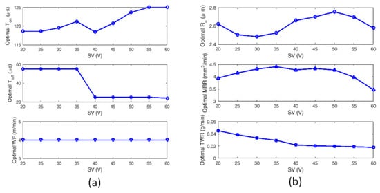 Figure 9a,b, shows the optimal control factors and optimal responses for WEDM of medical grade NiTiNOL SMA, for all the variations of SV from 20–60 V. It can be observed from Figure 9a that, the optimal Ton is increasing with SV in an incremental manner from 20–50 V and further stabilizes thereafter. The optimal value of Toff is constant till SV reaches 35 V and then takes a sharp drop for the next 5 V and then it is found to be constant till it reaches 60 V. However, the optimal WF rate is found to be 4 m/min without any deviation for all the values of SV. Figure 9b shows the optimal responses for WEDM of medical grade NiTiNOL SMA. From Figure 9b, it can be observed that Ra (SR) is initially getting decreased over the small increments of SV from 20–35 V. Further, increase in SR is observed from 35–60 V. The optimal SR values are obtained in the range 25–35 V of SV. MRR is found to be better in the range of 30–50 V. From the optimization results, it is clearly observed that very close and very large spark gaps between work material and wire electrode are not recommended for higher MRR. In the range of 30–50 V, the MRR reaches the best possible response with the value of 4.5 mm3/min. The optimal TWR decreases with increased SV in the range 20–60 V. However, it is observed that the optimal TWR almost remains constant in the range 40–60 V. Hence it is beneficial to select higher SV in the range 40–60 V for minimal TWR. The modified DE based results illustrated in the current study are one such probable best solution.