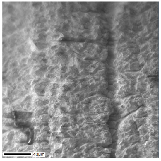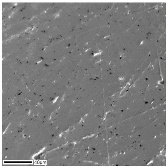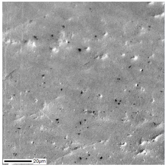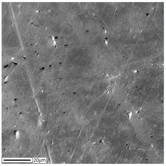 The SEM image of the cross-section of the Ti–28Nb–5Zr bar is shown in Figure 8, and the results of the analysis of the distribution of alloy elements are shown in Figure 9. A uniform distribution of all elements was noted. On the map of titanium, heterogeneity was observed, which was due only to the textured surface as a result of polishing, and not to the titanium content gradient.