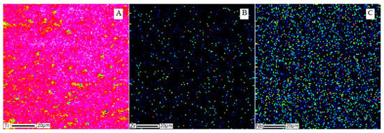 Elemental distribution of metals in the structure of the Ti–28Nb–5Zr alloy after annealing at 900 °C for 12 h: (A) titanium; (B) zirconium; (C) niobium.