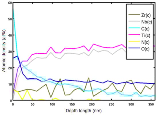 The surface morphology of the Ti–28Nb–5Zr alloy wire is shown in Figure 10. High roughness and heterogeneity were noted. However, in terms of chemical composition to a depth of more than 200 nm, a uniform oxide film without impurities was observed. After surface treatment, microdefects were smoothed out and the oxide layer decreased to 50 nm (Figure 11).