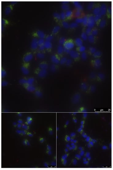 Data on cell density, mitotic index, and the number of non-viable cells in the presence of the wire obtained are presented in Table 2. Figure 14 shows the results of fluorescence microscopy in several sections of the sample. The number of cells per area of 1 mm2 (by the number of nuclei stained with Hoechst 33342, which penetrates the plasma membrane and binds to DNA in the nucleus), the percentage of cells in the state of division (mitotic index, MI, is determined by the presence of visible chromosomes), the number of dead cells (according to the fluorescence of propidium iodide, which does not penetrate viable cells, but stains DNA in the nuclei of dead cells and cells with impaired membrane permeability) were estimated. All samples were biocompatible. Mitochondrial activity and good cell survival were observed.