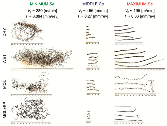 When turning with vc~194 m/min and f~0.36 mm/rev under dry, wet and MQL machining conditions, long spiral chips were obtained and for machining with MQL+EP long screwed chips were observed.