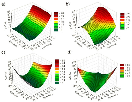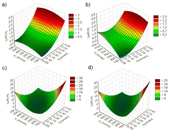 The software used made it possible to determine statistical models (Table 2) and graphs of the relationship between Sa (Figure 3), Sz (Figure 4) and Sq (Figure 5) values and feed and cutting speed.