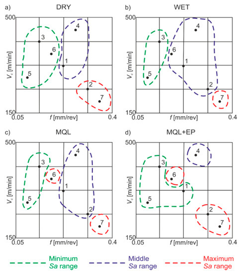 When dry machining, minimum Sa was registered for lower f and medium and higher vc values, middle Sa—for medium f and medium and higher vc values, maximum Sa—for higher f and lower vc values. Under wet machining conditions, minimum Sa was obtained for lower f and medium and higher vc, middle values—for medium and higher f with all vc, maximum Sa—for higher f and vc. Under MQL conditions, minimum Sa values were registered for lower f, medium and higher cutting speeds, middle values—for medium and higher feeds in the investigated cutting speed range, maximum values—for medium feeds and cutting speeds and also for lower feeds and higher cutting speeds. Under MQL+EP conditions, minimum surface roughness values were obtained for lower feeds and medium cutting speeds, as well as for medium feeds and cutting speeds, middle values—for medium feeds and higher cutting speeds, maximum values—for medium feeds and cutting speeds, as well as for higher feeds and lower cutting speeds.