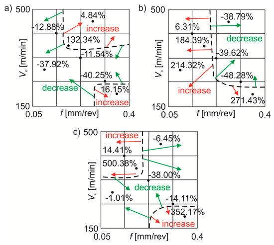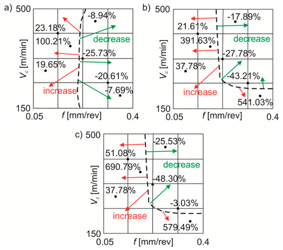 The main dividing line (black dotted line) of the Sa value changes was registered with f~0.2 mm/rev (Figure 7). During wet machining compared to dry machining the Sa parameter decreased by ~8–26% or increased by ~20–100%. For MQL machining in comparison with dry machining, the Sa parameter was reduced by ~18–43% or increased by ~22–541%. Cutting under MQL+EP conditions in comparison with dry cutting reduced the Sa value by ~3–48% or increased it by ~38–690%.