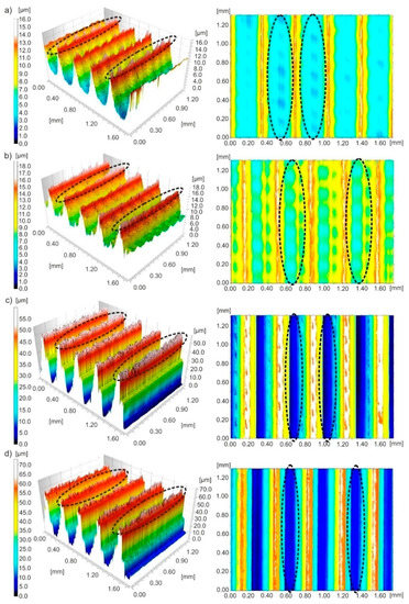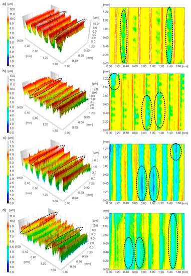 Typical texture irregularities on the surface of the machine, namely peaks on 3D images and pits on contour maps, are marked in Figure 10, Figure 11 and Figure 12 with black dotted lines.