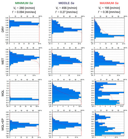 Figure 6 shows the areas of minimum (0.4–0.8 μm), middle (0.8–1.3 μm) and maximum (1.3–15.0 μm) Sa values obtained under dry, wet, MQL and MQL+EP conditions.