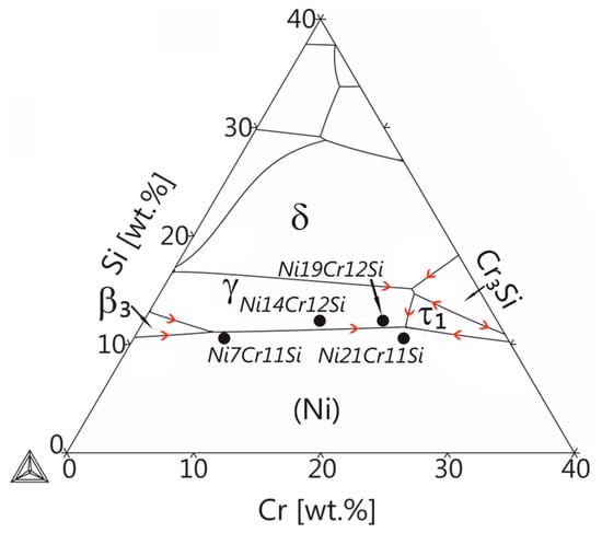 At a high cooling rate of 11,000 K s−1, τ-Cr6Ni16Si7 phase appears in the microstructure rather than γ-Ni31Si12 and π-Cr3Ni5Si2. It is very likely that γ-Ni31Si12 and π-Cr3Ni5Si2 phases are the product of decomposition of τ-Cr6Ni16Si7 phase, which was prohibited by rapid cooling. However, it is ambiguous whether τ-Cr6Ni16Si7 phase or τ1 phase is in phase equilibrium since the stability of τ-Cr6Ni16Si7 phase in Ni-Cr-Si system is not established [15,36]. Nevertheless, the phase transformation pathway was severely altered by increasing the cooling rates indicated by the presence of metastable high-temperature ternary phases [13] in the terminal microstructure see Figure 5f,h.