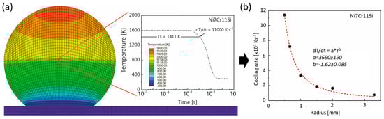 The emissivity of Ni-Cr binary alloys [27] was employed in the model. Other thermophysical properties, i.e., thermal conductivity [28], the temperature-dependent density [29], specific heat [30], were adapted from Ni-Cr alloys with similar amounts of solutes. In the model, the initial droplet temperature was set to 1600 K. The calculated cooling rates at the solidus and liquidus temperature are in the same order of magnitude, and the difference is relatively small. Therefore, the average cooling rates between liquidus and solidus temperature in the center of the sphere was considered in this work (cf. Figure 2a). Figure 2b summarizes the simulation effort and relates directly the cooling rate to the spherical dimensions of the liquid droplet. The subsequent microstructural analyses were also conducted at the position where the cooling rates were calculated. The cooling rates corresponding to the sample size of 0.5 and 2 mm radius are 11,000 K s−1 and 1600 K s−1, respectively.