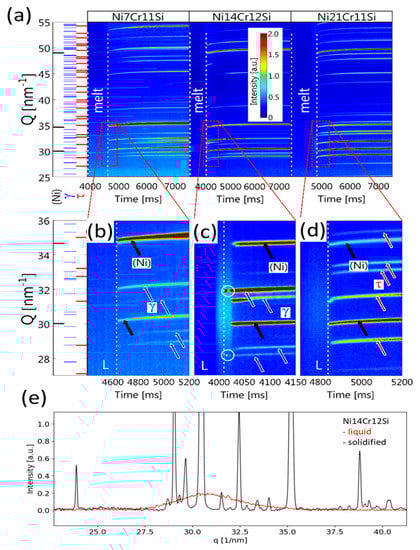 Synchrotron diffraction patterns were collected throughout the melting and the solidification cycle for three of the investigated alloys: Ni7Cr11Si, Ni14Cr12Si and Ni21Cr11Si. (a): 1D profile of diffraction pattern of Ni21Cr11Si melt; (b): Map of diffraction patterns; (c,d): Maps of diffraction patterns at the early stages of cooling; (e) diffraction pattern of liquid and solid Ni14Cr12Si.