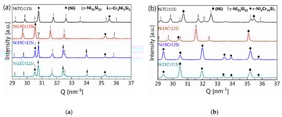 To understand the phase formation during rapid solidification processes in more detail, post mortem XRD measurements for all alloys were taken and are displayed in Figure 4 for two different heat extraction rates, i.e., Figure 4a at 1600 K s−1 and Figure 4b at 11,000 K s−1. The diffraction patterns displayed in Figure 4a were acquired using a parallel beam geometry probing planes with their diffraction vector k perpendicular to the solidification direction. This is in contrast to the diffraction patterns displayed in Figure 4b. Here, each diffraction pattern is derived from a 2D in situ synchrotron measurement which stem from azimuthally integrated 2D detector. The integrated diffraction patterns show better signal to noise ratio, possess better statistics for phase identification and quantitative analysis, and are less influenced by texture, large grain size, or small quantity. The post mortem XRD patterns of Ni7Cr11Si and Ni14Cr12Si rapidly solidified with a 1600 K s−1 thermal gradient in Figure 4a show that both alloys have similar phase components, i.e., (Ni) and γ-Ni31Si12. A shift of the distinct phase peaks toward higher Q values, which can be observed for the Ni7Cr11Si is presumably due to the solidification phase sequence and the lower Cr content in this sample, leading to the slightly smaller Ni unit cell dimensions. Comparing Ni19Cr12Si and Ni21Cr11Si, both alloys consist of three different phases, i.e., (Ni), γ-Ni31Si12 and π-Cr3Ni5Si2, respectively.