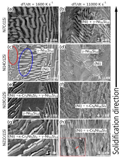 In both the Ni19Cr12Si and Ni21Cr11Si alloy, a ternary eutectic microstructure (Ni) + π-Cr3Ni5Si2 + γ-Ni31Si12 is observed as shown in Figure 5e,g. It is interesting that an anomalous (Ni) + τ-Cr6Ni16Si7 eutectic-like structure is present in these two alloys at the highest cooling rate of 11000 K s−1. However, the morphology is very much different for the two different alloys, one is stripe as reported in [35] (Figure 5f) and the other is a mixture of fine lamellae and relatively coarse anomalous eutectic zones as seen in Figure 5h.