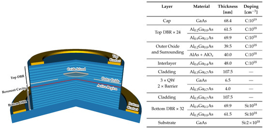 Schematic diagram and layers summary of the analyzed VCSEL. In the image, the active region is marked in red and there are two oxide layers (marked in beige). The outer layer, manufactured classically, is at the edge of the cavity, and the oxide island (shown in full) is in one of the As layers in the top DBR.