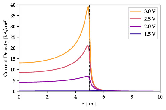 Current density distribution in the active region for several contact-to-contact voltages in a structure without an oxide island. There is some current-crowding at the outer oxidation edges, but only at high voltages. The dashed vertical line indicates the outer oxide aperture radius.