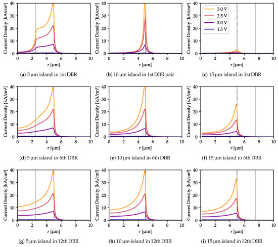 As can be seen in Figure 1, if the oxide island is located in the lower part of the bottom DBR there is not much space for current flow between the oxidation layers. This should result in very strong current-crowding near the outer oxidation edges. Such an effect can be expected to increase with larger oxide island diameters and to decrease as the distance between the island and the cavity increases (i.e., when the island is located in more distant DBR layers), as this impacts the area at which the current may spread. To confirm this expectation, we computed the current density distributions in the active region for several voltage values. Figure 2 shows these distributions for a structure with no oxide island. Below 2 V, there is only slight current-crowding, increasing to a moderate level at higher voltages. The situation is different with an oxide island (Figure 3). If the island is located close to the cavity (in the 1st DBR pair, Figure 3a–c), it effectively blocks the current flow beneath it. In the case of a moderate distance (in the 6th pair, Figure 3d–f), its impact is still visible. If it is placed in the 12th pair (Figure 3g–i) or above, it has a minor impact on current-crowding (although there is still some).