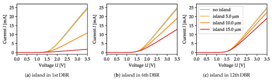 I-V curves for islands located in the 1st, 6th, and 12th DBR pairs for three different oxide island diameters. The impact of the island on structure resistivity is significant if it is close to the cavity and decreases with increasing distance.