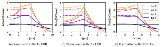 Although—even in the structure with no oxide island—current-crowding is evident for voltages above 2.5 V, the gain distribution is much more uniform due to the carrier diffusion. The gain profile shows a significant dip in the structure center only if the oxide island is located close to the cavity (Figure 5a,b). However, if the the oxide island is located far enough away from the cavity (in the 12th DBR pair in this case), it only slightly influences the gain distribution (Figure 5c). Hence, in this case, the antiresonant effect and its impact on the optical mode thresholds (analyzed in detail in the next section) is not affected by the distorted gain distribution.