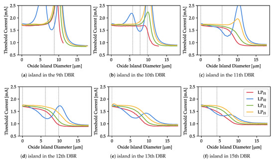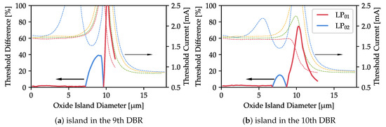 From a practical point of view, the impact of the oxide island on the lasing threshold of different-order modes can be used to ensure single-mode operation of the laser. To achieve this goal, we must ensure that one of the modes is strongly preferred over the others. As the results presented in Figure 6 suggest, this is possible for islands located closer to the cavity, i.e., in the 9th or 10th DBR pair. Figure 9 shows the threshold discrimination in these cases, defined as