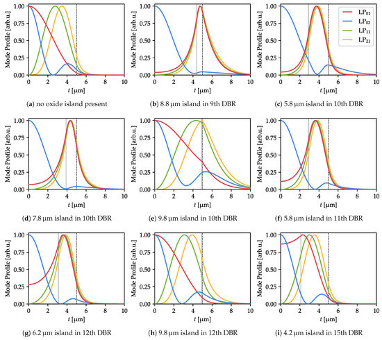 The oscillations in the threshold current are similar in character to the oscillations of the cold-cavity modal loss we investigated in [27]. There, we explained such oscillations in terms of the match/mismatch of the optical mode profile with the island aperture. In the present work, the situation is different, as the oxide island is located not in the cavity but in the top DBR. However, the origin of the threshold variations is the same: match or mismatch of the modal profile with the antiresonant oxide aperture. As evidence, we present the profiles of the optical modes in selected characteristic points (defined by the size of the oxide island and its vertical position, indicated with vertical gray dashed lines in Figure 6), where the threshold currents presented show peculiar behavior (Figure 8).