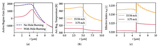 The input current of 3.75 mA, at which the mode appears is higher than its estimated threshold shown in Figure 6b (2.17 mA). This is caused by the spatial hole burning effect induced by the mode, which was neglected in the earlier calculations. However, it is shown in Figure 10a, which presents comparison of the gain profile at 3.75 mA determined neglecting spatial hole burning and with taking it into consideration.