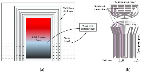(a) Multishell-mold structure and water-immersion cooling method (MSMWI); (b) four-layer-shell sand mold.