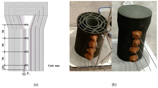 (a) Thermocouples (P1–P4); (b) 3D-printed sand mold and thermocouples.