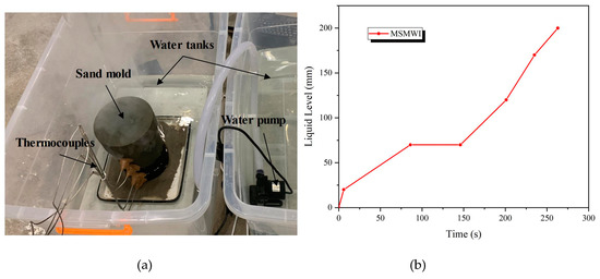 (a) Poured multishell sand mold cooled in water tank; (b) water-level history for MSMWI.