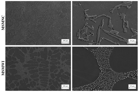 The microstructures of the castings are shown in Figure 6. In the MSMNC casting, α-Al grains were coarse with rough boundaries, and the eutectic silicon was large, with irregular and sharp contour, around 10–50 μm long. However, in the MSMWI casting, the alpha dendrites showed round and typical secondary arms, the eutectic silicon phase was fine particles, around 2–8 μm in diameter, around a fiftieth of that in the MSMNC casting.