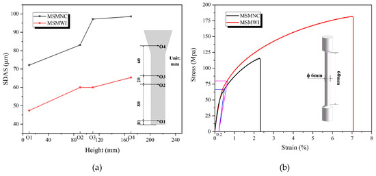 The stress–strain curves of MSMNC and MSMWI are shown in Figure 7b, and tensile-strength, yield-strength, elongation, and hardness data are listed in Table 2. Compared to MSMNC, the mechanical properties of MSMWI were obviously improved, tensile strength increased by 56%, yield strength by 20%, elongation by 185%, and hardness by 62.6%. For thick castings, the enhancement of mechanical properties is more significant.