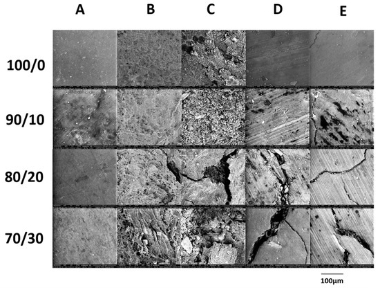 SEM micrographs of the neat P(3HB-co-4HB) (100/0) and P(3HB-co-4HB)/WF composites with the mass ratio of 90/10, 80/20, and 70/30, before (A) and after 21 days of degradation in BIODEGMA (B), Respirometer (C), water (D), and buffer (E). (Original SEM photos in the Supplementary Material Figure S1).