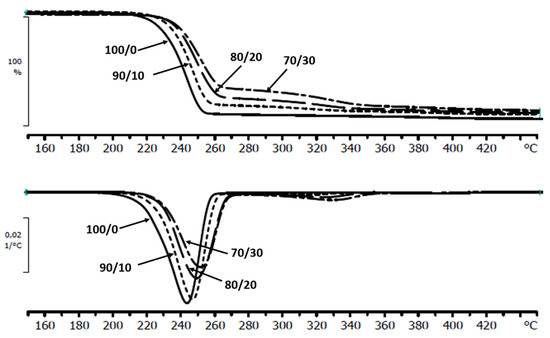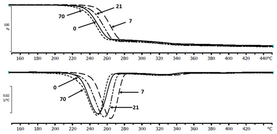 The thermal decomposition curves of the neat matrix before and after degradation in the investigated environments followed a single mass-loss step. For the composites, the second step of mass loss occurred. The first step of mass loss refers to the thermal degradation of polymer matrix, the second to the thermal degradation of wood components. The addition of the natural filler caused the increase of the temperature of the maximum decomposition rate (Tmax) of obtained materials. The stability of composites increases with the increase of wood flour (Figure 2).