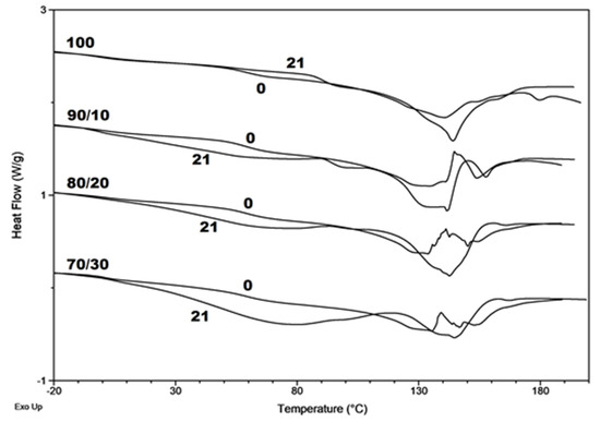 Selected differential scanning calorimetry (DSC) curves (first heating run) for the neat P(3HB-co-4HB) (100/0) and P(3HB-co-4HB)/WF composites with the mass ratio of 90/10, 80/20, and 70/30, before (0) and after 21 days degradation in water (21).