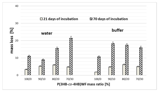 Evaluation of mass changes of the specimens’ during degradation in compost is very complicated due to the cleaning process from a compost environment, especially after disintegration of the specimens had taken place. Thus, Figure 5 presents the mass loss only for samples after degradation in water and buffer. The determined value of the sample’s mass loss, after 21 days of incubation in both water and buffer, increasing with the increase of the wood flour content till 20 wt. % in the composites studied. After degradation in water the significant effect of the wood flour content on the mass loss was found after 70 days of degradation which can be result from improving water penetration into the disintegrated samples. This phenomenon can be explained by the hydrophilic character of the filler and water uptake. Wood flour absorbed water, in proportion to its content in the composites, from the beginning of the incubation process (Figure 6). A similar observation has been reported in the studies on PLA degradation [42]. In the case of P(3HB-co-4HB)/10WF composite, the reverse trend is observed. Ten weight percent of the filler can easily be entrapped within the polymer matrix, which resulted in less water uptake by the composite and lower mass loss after 70 days of incubation (Figure 5 and Figure 6). Degradation in a buffer at a constant pH leads to decrease of mass loss after 70 days of incubation with the filler amount increase (Figure 5) which can be resulted by the reduction of autocatalytic effect. This could be caused by the better penetration of samples by the buffer.