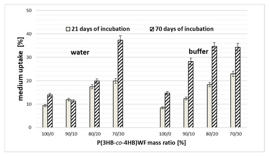 Medium uptake after 21 and 70 days of degradation of neat P(3HB-co-4HB) and P(3HB-co-4HB)/WF composites.