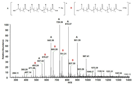 Recently, the multistage electrospray ionization mass spectrometry technique is an irreplaceable tool for the structural characterization of (bio)degradable polymers. This method provides valuable information about the monomer units and their sequences in the polymer chain [43]. The molecular structure of obtained degradation products of P(3HB-co-4HB) released to the water were verified by using the ESI–MSn. Figure 7 shows the positive-ion spectra of oligomers of P(3HB-co-4HB) after 70 days of incubation in water. The spectra consist of two series of sodium charged ions with different degrees of oligomerization. However, the monomer units of 3-hydroxybutyrate (3-HB) and 4-hydroxybutyrate (4-HB) are indistinguishable by mass spectra because they have the same molar mass (86 Da) [44]. The main series of ions on the spectra (labeled as series A) that appears at m/z = [104 + (86·n)] + 23 (n is a number of HB repeating units) correspond to the sodium adducts of oligo(3-hydroxybutyrate-co-4-hydroxybutyrate) (oligo(3HB-co-4HB)) chains terminated by carboxyl and hydroxyl end groups. Whereas, the second series of ions (labeled as series B) correspond to the sodium adducts of oligo(3-hydroxybutyrate-co-4-hydroxybutyrate) sodium salt of chains terminated by carboxylate and hydroxyl end groups.