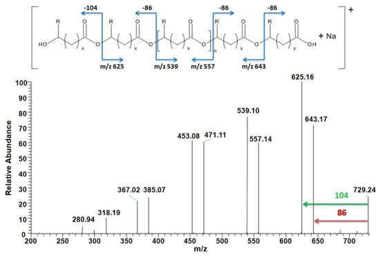 ESI–MS/MS fragmentation experiment for the ion at m/z 729 of oligo(3HB-co-4HB)/30WF after 70 days of degradation in water (for 3-HB units R = CH3 and x = 1; for 4-HB units R = H and x = 2) (see Figure 7).