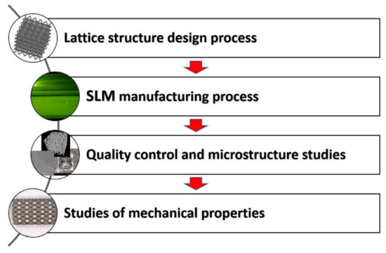 The main goal of the paper is a presentation of results of experimental investigations related to the mechanical properties of lattice structures made additively from SS316L stainless steel. Developed specimens with different values of relative density were manufactured via selective laser sintering SLM and submitted to mechanical and structural tests according to methodology presented in Figure 1. This paper is a continuation of the authors’ works related to additively manufactured lattice structure made from 316L stainless steel. Results associated with this work were partially published in [61,62,63].