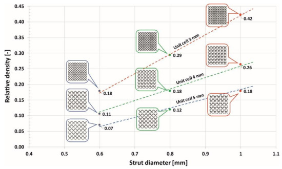 The adopted geometrical parameters enabled obtaining specimens with similar dimensions but varied values of relative density. A detailed map of the specimen relative density in terms of the geometrical parameters is presented in Figure 3.