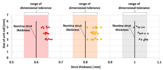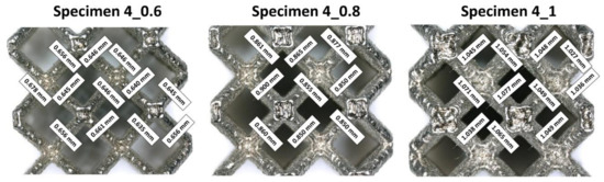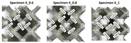 On the basis of the analyses of captured photograph, a visible difference in the geometrical deviation of the lattice strut diameter values was observed, depending on the specimen orientation in relation to the building direction (layer plane). The chart in Figure 6 presents the assumed and real values of the lattice struts and unit cells dimension defined during measurements which were defined during measurements in the top plane (parallel to layers plane). It can be observed that the average dimensional deviation of the lattice strut diameter was approximately 0.05 mm. These divergences were mainly caused by the additive characteristics of the manufacturing process and the size of the adopted SS316L stainless steel metal powder grains. A selected fabrication layer thickness equal to 30 μm influences the surface roughness and causes the edges of material layers to be significantly visible. Further analysis of the lattice structure dimensional deviations revealed that the lattice strut diameters measured in the side-view orientation were significantly different from those measured from the top-side view. Detailed values of the dimensional deviations determined for specimens with a unit size equal to 4 mm are presented in Figure 7 and Figure 8. On the basis of the presented photographs, it can be stated that irrespective of the designed strut diameter value, the deviations range from 0 to 50 μm. Nevertheless, the dimensional deviations defined in the side-view orientations are relatively higher than those in the top-view orientation which corresponds to the building direction.