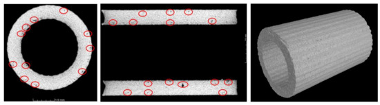 Structural imperfections such as pores, voids, and microcracks were evaluated by a Nikon Metrology XTH 225 CT (Nikon Corporation, Tokyo, Japan) and a Phenom ProX SEM (Thermo Fisher Scientific Inc., Eindhoven, The Netherlands). On the basis of the captured CT images, it was possible to determine the presence of structural imperfections that could exist in additively manufactured specimens, such as small areas of porosity and voids. These problems of homogeneity in additively manufactured materials have also been observed by other scientists [69,70,71,72,73]. One of the commonly available methods for reducing the influence of structural imperfections in additively manufactured metal materials is additional postprocessing such as heat treatment or HIP (high isostatic pressure) [74,75,76]. In the present work, the sizes of the observed voids were not significant, so additional postprocessing was not applied. The measured value of the material porosity was lower than 0.5%. Figure 9presents a sampling of the captured CT images of the respective specimens. Voids marked in red color were located in various regions of the lattice specimens. Additionally, CT analysis was conducted using cylindrical specimens dedicated to the mechanical characterization of 316L stainless steel manufactured additively. On the basis of the captured CT images (Figure 10), similar material imperfections were also found. This result means that these imperfections were not related to the geometrical complexity of the fabricated objects but were generally caused by the adopted method of manufacturing. Considering the high ductility of SS316L stainless steel and the deformation of the specimens during compression, the authors determined that additional postprocessing was unnecessary.