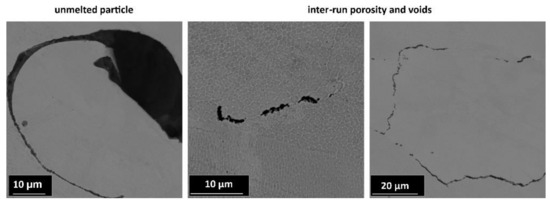 On the cross-section view of the SLM-produced structures, some defects with different origins are visible in Figure 12. Such defects are common in SLM and may limit the application of structures produced by this method by lowering their mechanical properties [73,74,82,83]. Defects observed in fabricated structure specimens may be classified as follows: pores, incomplete fusion holes, and cracks. The detected porosity, which consisted of pores that were mostly small in size and spherical in shape, can be attributed to insufficient powder packing during SLM; thus, the gas present between the powder particles might have dissolved in the molten pool. Pores formed from dissolved gas are trapped inside the molten pool due to extremely fast cooling. Moreover, spaces between the melt pools during successive laser passes may also be a source of so-called “inter-run porosity”. Notably, unmelted particles and incomplete fusion holes, known as lack-of-fusion (LOF) defects, may also remain inside the areas of non-overlapped laser beam tracks. The reason for the observed cracks and microcracks is the large temperature gradients and high cooling rates during SLM, which cause internal thermal stresses. Additionally, stainless steel is characterized by a low thermal conductivity and a high thermal expansion coefficient, which makes it even more vulnerable to generating cracks [73,75,80].