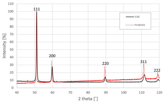 The XRD patterns of the 316L powder precursor and SLM-produced cellular structure are shown in Figure 13. Both XRD patterns clearly reveal the presence of a single face-centered cubic (fcc) austenite phase. It should be noted that a certain broadening of the peaks is observed which is mainly caused by the formation of the refined microstructure during the SLM process. Moreover, the slight shifting of the austenite peaks into the higher angles is noticeable implying the increase of residual stresses after the SLM. It is worth adding that the intensities of the peaks were normalized so that the strongest peaks were 100. For the SLM structure, except of the strongest peak, all the other peaks have lower intensity than those obtained for powder which indicates <111> preferential crystal orientation for the SLM process.