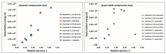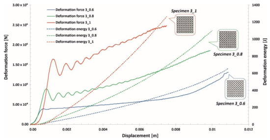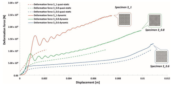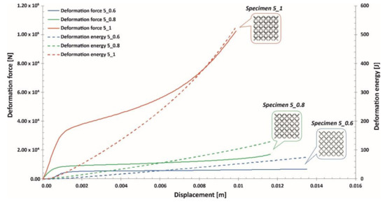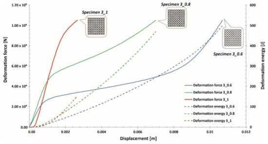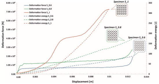 Analyzing the plots of the deformation force indicates that specimens with higher relative densities (Specimen 3_1, Specimen 4_1) had high geometrical stiffness values, which caused visible fluctuations during the dynamic compression tests. Specimens with lower relative density values (Specimen 3_0.6, Specimen 4_0.6, Specimen 5_0.6) were less vulnerable to fluctuations in the deformation force plot during the initial stage of compression. Nevertheless, in the final stage of deformation and before densification, they were subjected to bending, which caused a visible change in the plot history (Specimen 3_0.6, Specimen 4_0.6, Specimen 5_0.6).