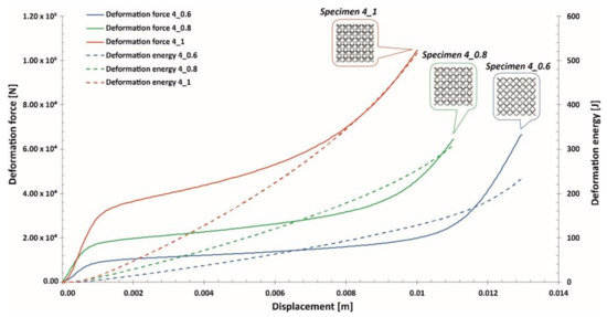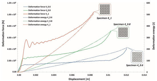 Deformation force and energy plots determined for lattice structures with an elementary unit cell equal to 4 mm under dynamic tests.