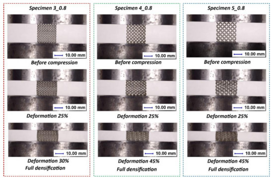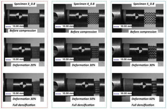 The investigations of the deformation process of the manufactured lattice structure specimens were initiated with quasi-static uniaxial compression tests. These tests were carried out with the use of a standard universal tensile test machine MTS Criterion C45 (MTS System Corporation, Eden Prairie, MN, USA) and TW-Elite software (MTS System Corporation, Eden Prairie, MN, USA), which recorded the history of the deformation process. The deformation velocity was 1 mm/s. As a result, plots of the compression process were determined for all variants of the specimen. They are presented in charts (Figure 14, Figure 15 and Figure 16) as deformation force and deformation energy curves. Additionally, the photographs in the plots below (Figure 17) illustrate the deformation process of specimens with elementary unit cells of 3, 4 and 5 and a lattice strut of 0.8.