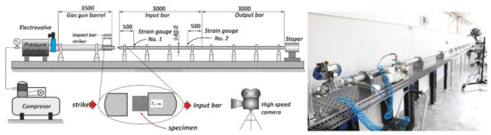 The subsequent stage of the conducted investigations involved uniaxial compression tests under dynamic loading conditions. They were realized through the use of a dedicated version of a Split Hopkinson pressure bar laboratory setup with bar diameters of 40 mm and lengths of 3000 mm. The scheme and the main view of the applied setup are presented in Figure 18.