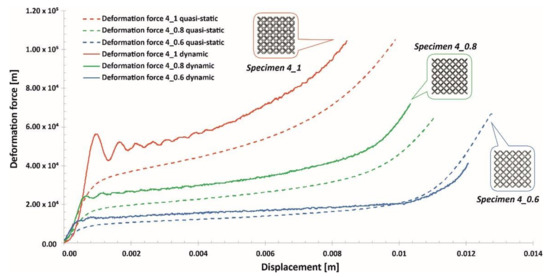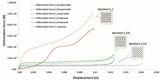 Compression tests of the lattice structure specimens under various loading conditions allowed a comparison of the results obtained regarding the effect of the deformation rate. In Figure 24, Figure 25 and Figure 26, the presented results show the history plots of the deformation force determined for all considered cases of unit cell size. Analysis of the obtained data indicates that significant differences between the quasi-static and dynamic results were obtained for specimens with higher values of relative density. Moreover, these differences were caused by inertia effects, which were easy to observe under dynamic loading conditions. Referring to the data presented in Figure 24, it can be observed that a low value of the unit cell size, corresponding to a high value of the strut diameter, caused the range of plastic deformation to be short and the densification phenomenon to occur relatively quickly. Moreover, the high relative density caused deformation rate effects in all cases. Regarding the plots presented in Figure 25, it could be stated that a significant influence of inertia effects on the deformation history plot was observed for Specimen 4_1. Nevertheless, the geometrical ratio of the unit cell size to the strut diameter enabled obtaining a smooth history plot with a wide range of plateaus. By analyzing the plots presented in Figure 26, it is easy to observe that the specimen with the lowest relative density (Specimen 5_0.6) was not sensitive to the deformation rate. The curves of the deformation plots obtained under quasi-static and impact-loading conditions are almost the same. Nonetheless, before the final densification of the specimens, the bending damage mechanism occurred rapidly, which caused a visible decrease in the force value.
